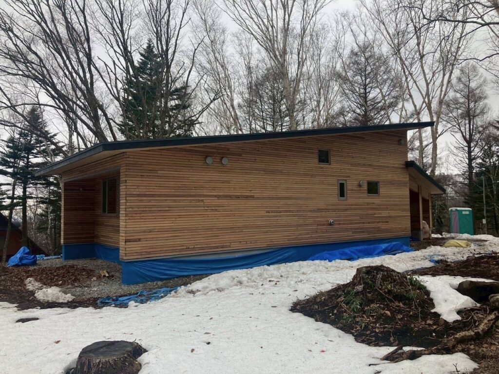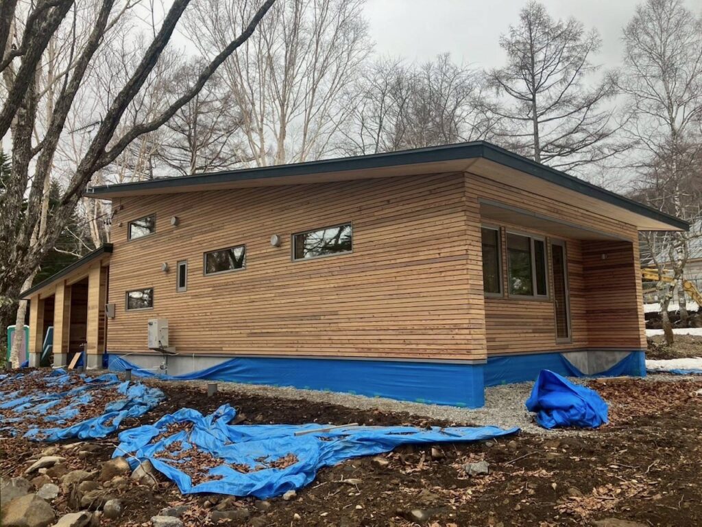 ファサードラタン施工の別荘は、いよいよ足場がとれて、全体が見えてきました。
