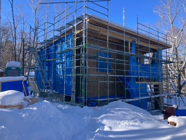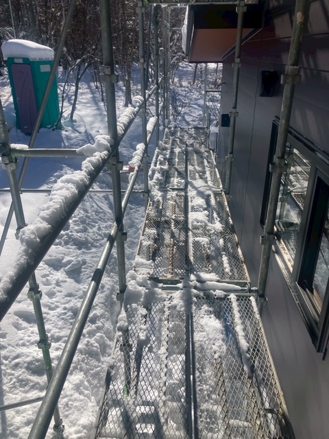 仮設トイレの上にも、そして足場の柵の上にも雪がのっているのが分かります。